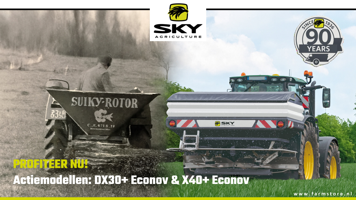 Ter gelegenheid van het 90-jarig bestaan lanceert SKY Agriculture twee speciale actiemodellen van haar toonaangevende kunstmeststrooiers: de DX30+ Econov en de X40+ Econov. Deze modellen in de speciale “90 jaar” editie combineren geavanceerde precisietechnologie met een aantrekkelijke prijsstelling, als eerbetoon aan negen decennia innovatie en vakmanschap in de landbouwmechanisatie.