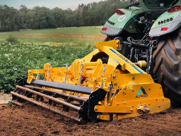 Alpego frezen hebben een centrale oliebadaandrijving met 2 rotorsnelheden. De transportbreedte van de frees is hierdoor tevens de werkbreedte is. Geschikt voor tractoren van 50 pk tot 220 pk.