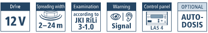 - Standaard bedieningsunit met 2‑regelig grafisch display (optioneel met AUTO‑DOSIS) of, voor de SuperVario® 110 LISA en SuperVario® 170 LISA, bediening via app met rijsnelheidsafhankelijke dosering