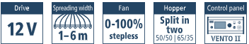 Met de VENTO® kunnen dankzij de extra sterke 12V‑ventilator mengsels van fijne en grove zaden, vang- en groenbemesters, slakkenkorrels, microgranulaten, meststoffen en gras veel efficiënter en voordeliger worden uitgestrooid dan met een hydraulische machine. De VENTO® beheerst bovendien moeiteloos hoge zaaihoeveelheden (bijv. 40 kg/ha gras of 120 kg/ha zaaizaad).