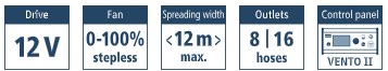 Bij de VENTO® Pro transporteren twee krachtige 12V‑ventilatoren het strooimateriaal via slang- en buisverbindingen naar individueel regelbare strooischijven (tussen 4 en 8 stuks), die vanggewassen of slakkenkorrels kunnen uitbrengen over een werkbreedte tot 42 meter.